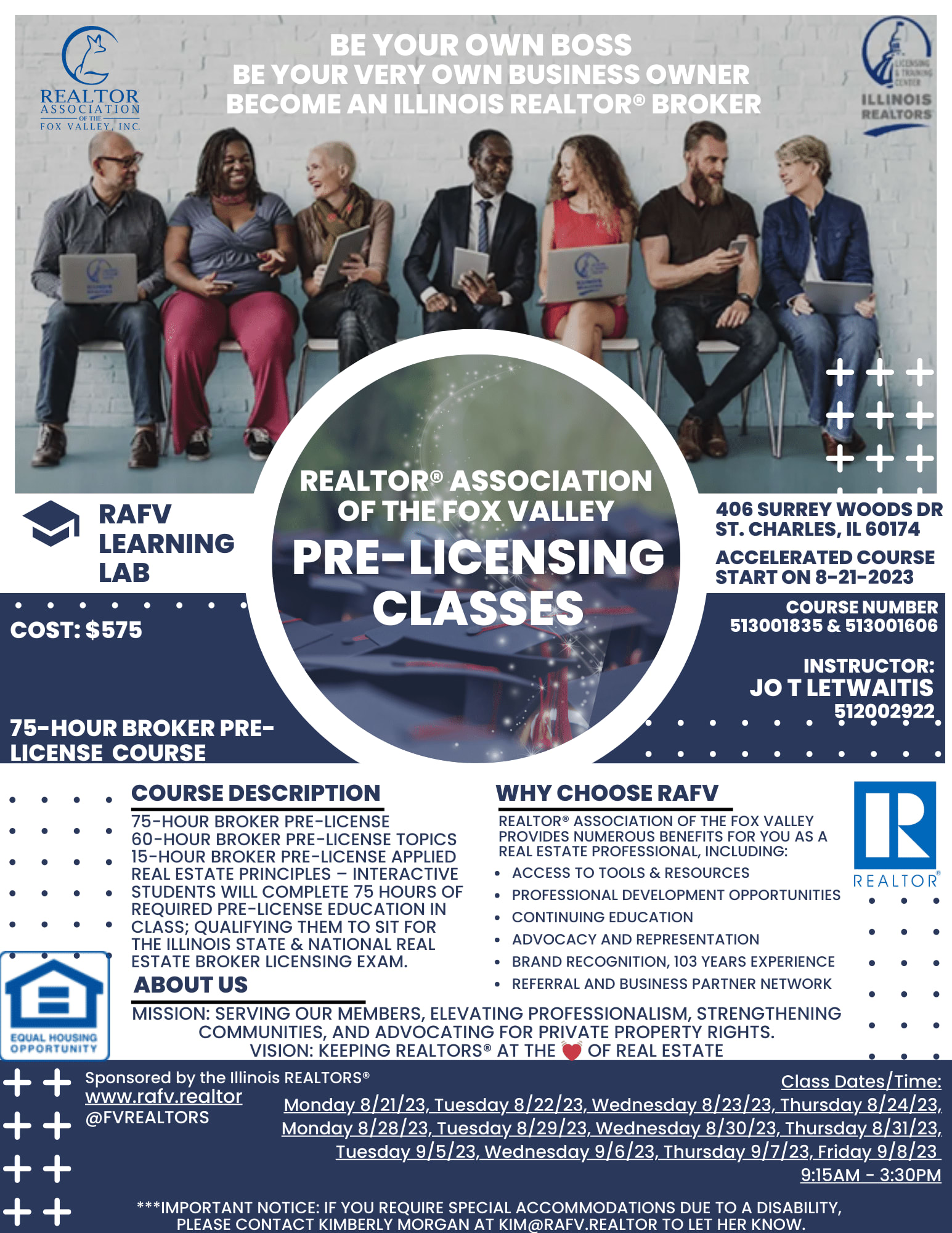 ***IMPORTANT NOTICE: If you require special accommodations due to a disability, please contact Kimberly Morgan at kim@rafv.realtor to let her know.