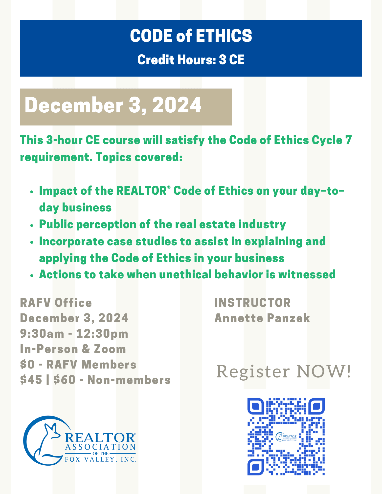 Everyday Ethics course, 3 hour CE. Instructor: Annette Akey Panzek. In-Person at RAFV and also available via ZOOM. This course will cover how the REALTOR Code of Ethics affects a REALTORS day-to-day business and its impact on our industry and how our business is perceived by the general public. Using case studies and examples, this course provides a basis to cite key components of the Code of Ethics and know what to do when unethical behavior is witnessed or there is a dispute about money. There is a $25 no-show fee for no-shows. All cancellations must be made in writing to john@rafv.realtor at least two days prior to the course. IMPORTANT NOTICE: If you have any disabilities that require special accommodations, please contact John Fitzgerald at john@rafv.realtor.Images