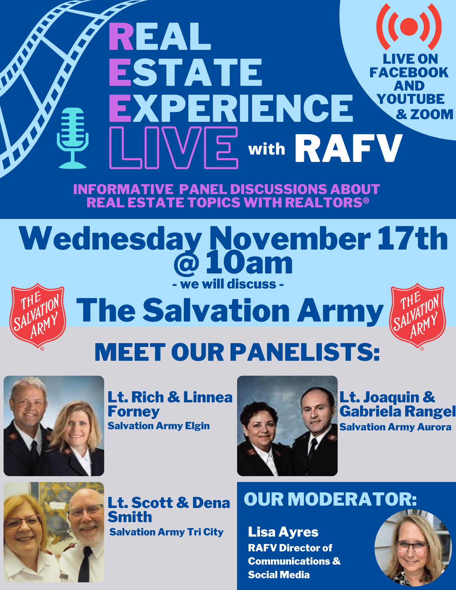 Join us as we kick off the holidays by talking with the leaders of our local Salvation Army locations and learning how we can give back. Joining us will be Lt. Rich and Linnea Forney of SA Elgin, Lt. Joaquin and Gabriela Rangel of SA Aurora and Lt. Scott and Dena Smith of SA Tri Cities in St. Charles. They will tell us how to help as well as how your money and time helps our community. Join us VIA ZOOM on Wednesday November 17th @ 10am.