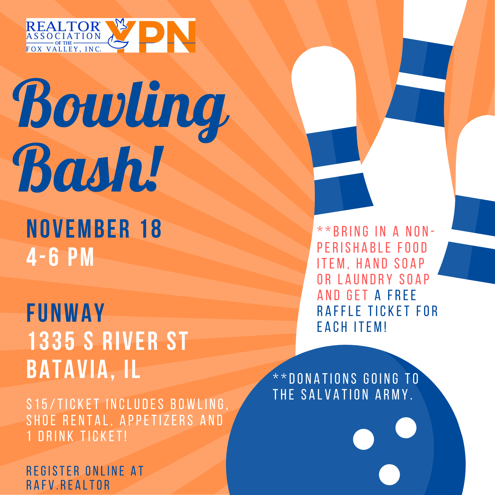 Join us on Thursday, November 18 from 4-6 PM at Funway in Batavia for a Bowing Bash sponsored by YPN! Tickets are $15 and include admission, bowling, shoe rental, appetizers and 1 drink ticket! Bring in a non-perishable food item, hand soap or laundry soap and get a FREE RAFFLE TICKET for each item (all donations will be going to the Salvation Army in St. Charles)! Also, register by 11/12 to get entered into an EARLY-BIRD RAFFLE!